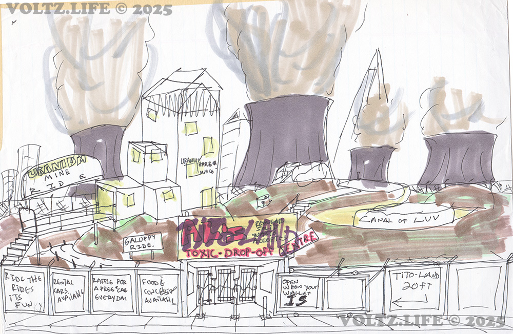 This is a concept drawing of Titoland. Specifically the Uranium Harbor location. 4.828 Kilo Island and Commercial Row in the west can been seen in the middleground and background- Or could that be some of the known hi rises of the East?