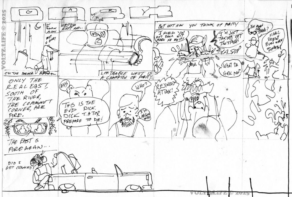 This is the first storyboard for the Dark Gary (Masalam) concept. The after-hours alter ego of Voltz’s lone Communist.