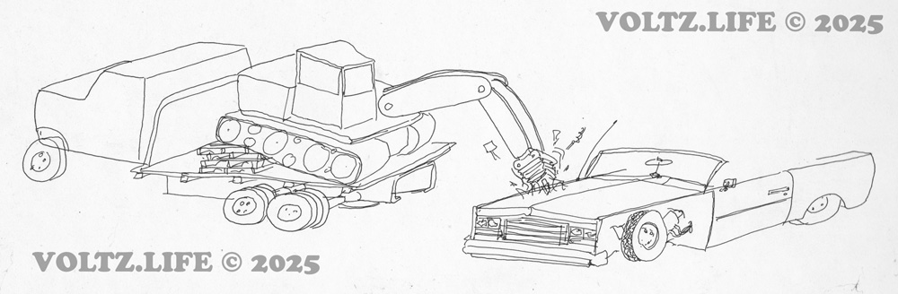 This unfinished work shows Gary’s Low Rider getting jackhammered by a piece of construction equipment. The original intent for this approximately legal size ink on bristol board drawing was to airbrush the color on. Fast forward two decades and it emerged from hiding on a book shelf. The drawing was finished in the medium it was started in but colored with marker and colored pencil which can be seen here. In it’s finished form it is known as Drama at the corner of Broad & Charles.