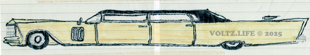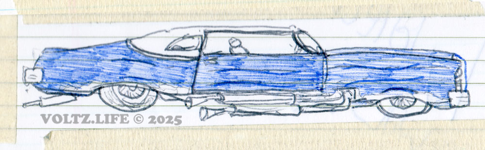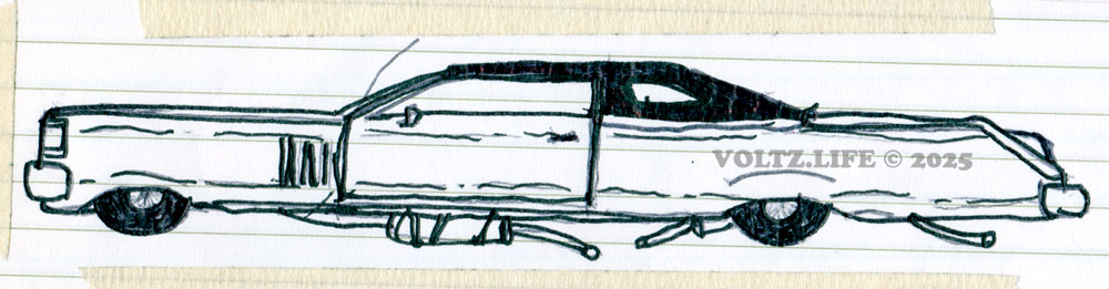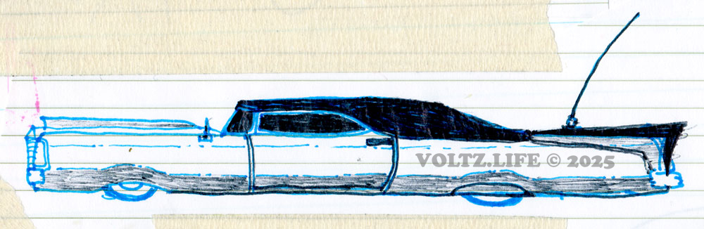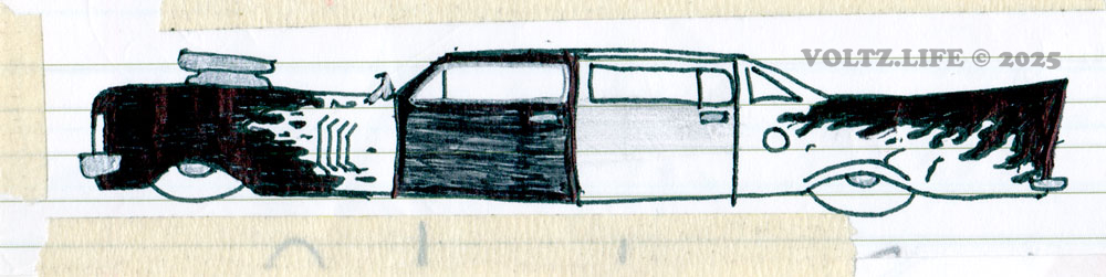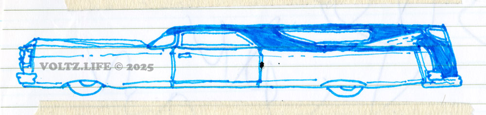 This half completed drawing shows Tito’s recent acquisition of the Joseph Doe Funeral Home (Buffet Available). Marketed as “Tito’s 10 Dollar Funeral Home” this side hustle provides mortuary options that lack respect and price. The 1980’s Ford town and country wagon can carry two caskets in the back and one strapped to the roof.