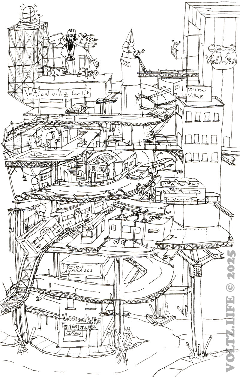 A vertically stacked city directly inspired by the Verticalville puzzles from the 70’s / 80’s. It also draws inspiration from the Archeologies (Arcos), from Sim City 2000. This ‘city’, in the East, is the hub of all things Toti and home of it’s largest tenant Voltza, the nearly defunct Voltz space/ rocket program.